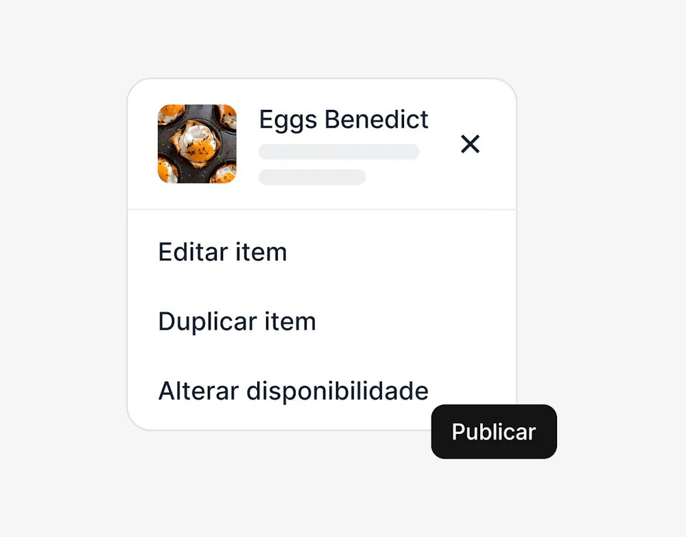 Tenha controle total do seu cardápio em todos os lugares. Adicione, exclua, atualize e marque temporariamente itens como indisponíveis em tempo real.