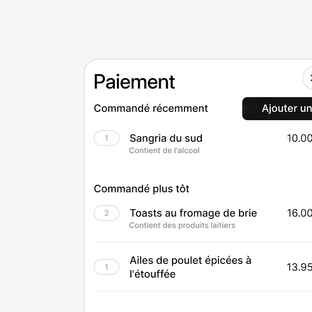 Permettez aux clients sur place de créer leur propre addition, d'ajouter des articles à leur addition existante et de consommer avant de la clore et de payer.