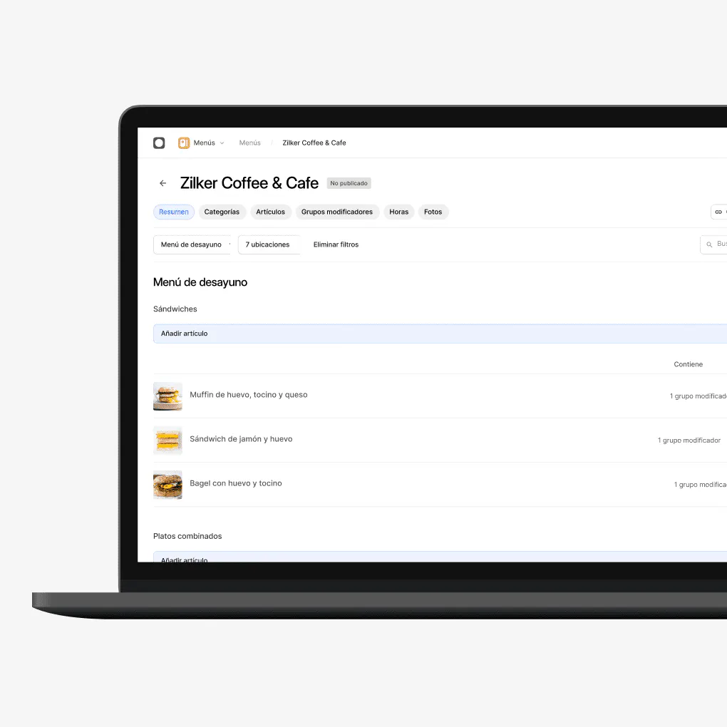 Sincroniza tus menús automáticamente, gestiónalos en todas tus ubicaciones y marca los artículos no disponibles en tiempo real.