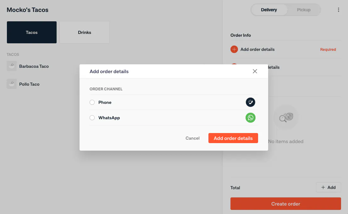 Nuestra nueva función de Pedidos Manuales te permite crear pedidos de forma manual a través de la tableta Otter sin importar el canal, lo que aumenta el alcance de los pedidos que puede monitorear y gestionar un restaurante. ¿Los clientes de la zona se contactan por teléfono? ¿Algunos te envían mensajes por WhatsApp? No te preocupes, ahora podrás lidiar con esas órdenes usando el mismo proceso de Otter que ya utilizas para el resto de tus pedidos.