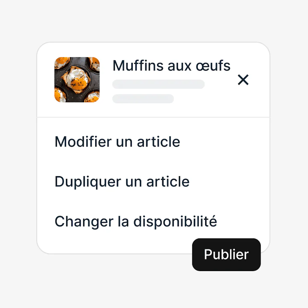 Gardez tous les articles du menu à jour grâce à la fonctionnalité de modification en bloc. Ajoutez, supprimez ou modifiez des articles en temps réel, sur tous vos canaux de vente.