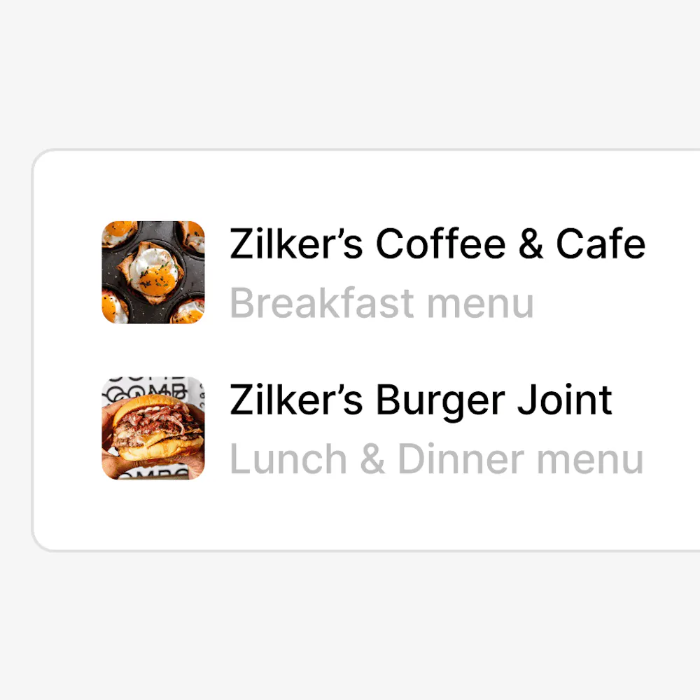Separa los menús por categorías, como desayuno, comida y cena. Varía los menús según la ubicación y mantén los cambios sincronizados a medida que las cosas evolucionan.
