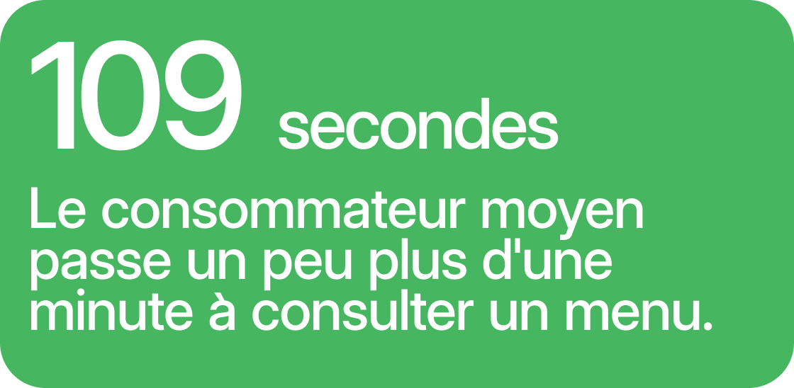 - Le consommateur moyen ne consacre que 109 secondes à la lecture d'un menu. Mettez vos best-sellers en tête de liste !