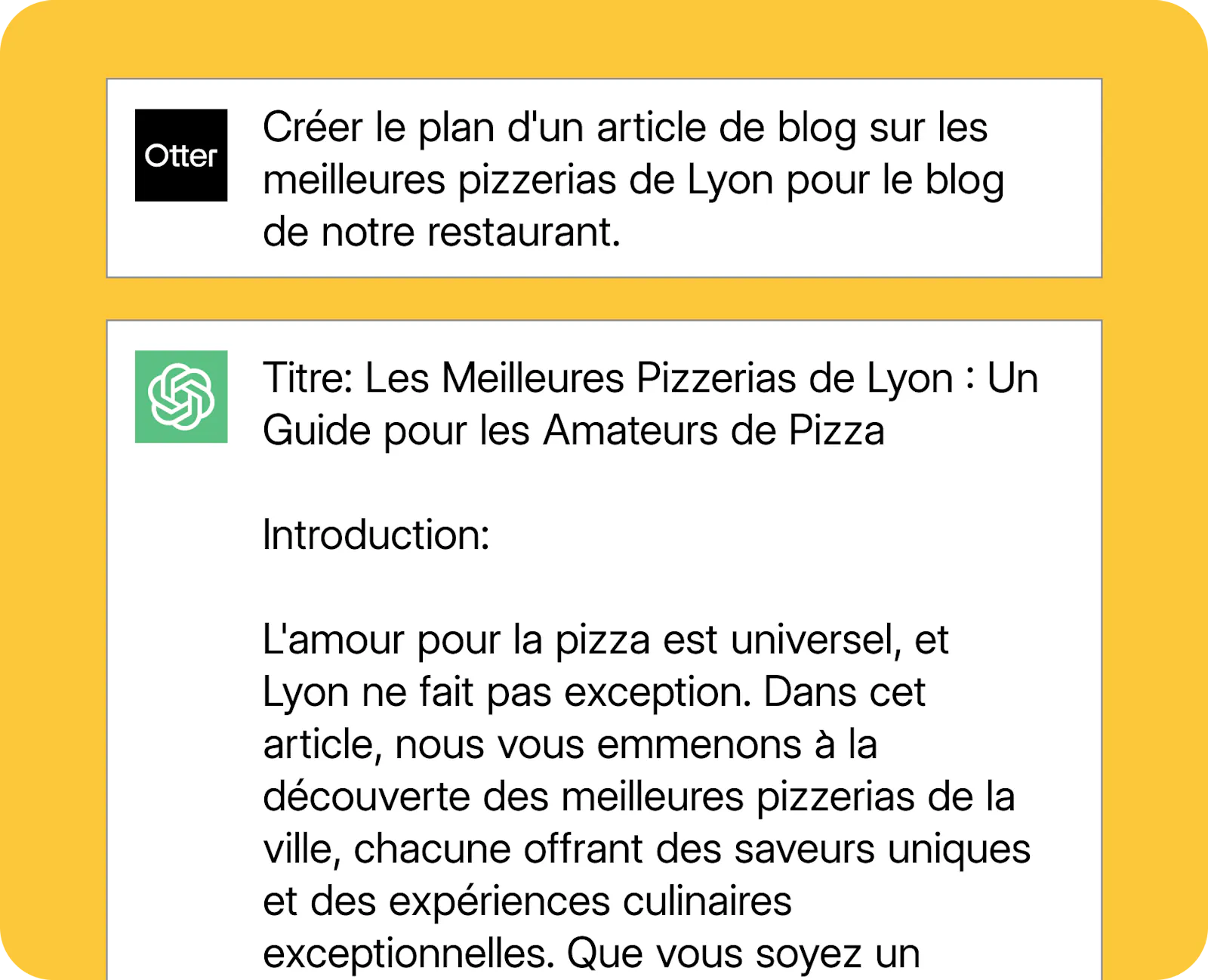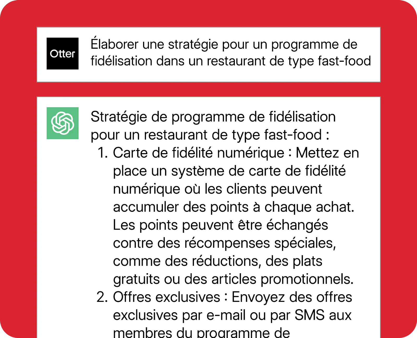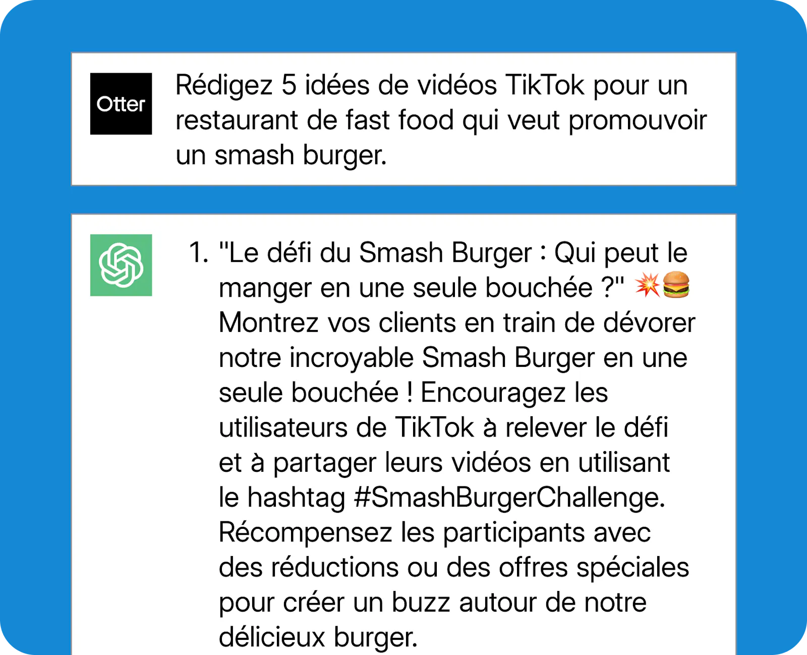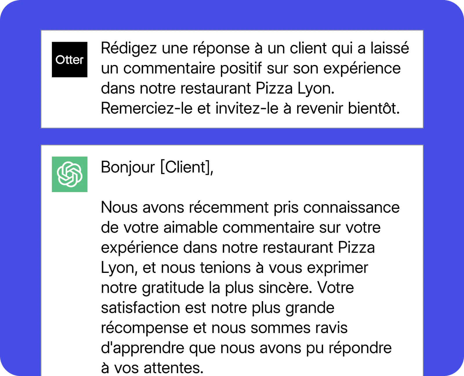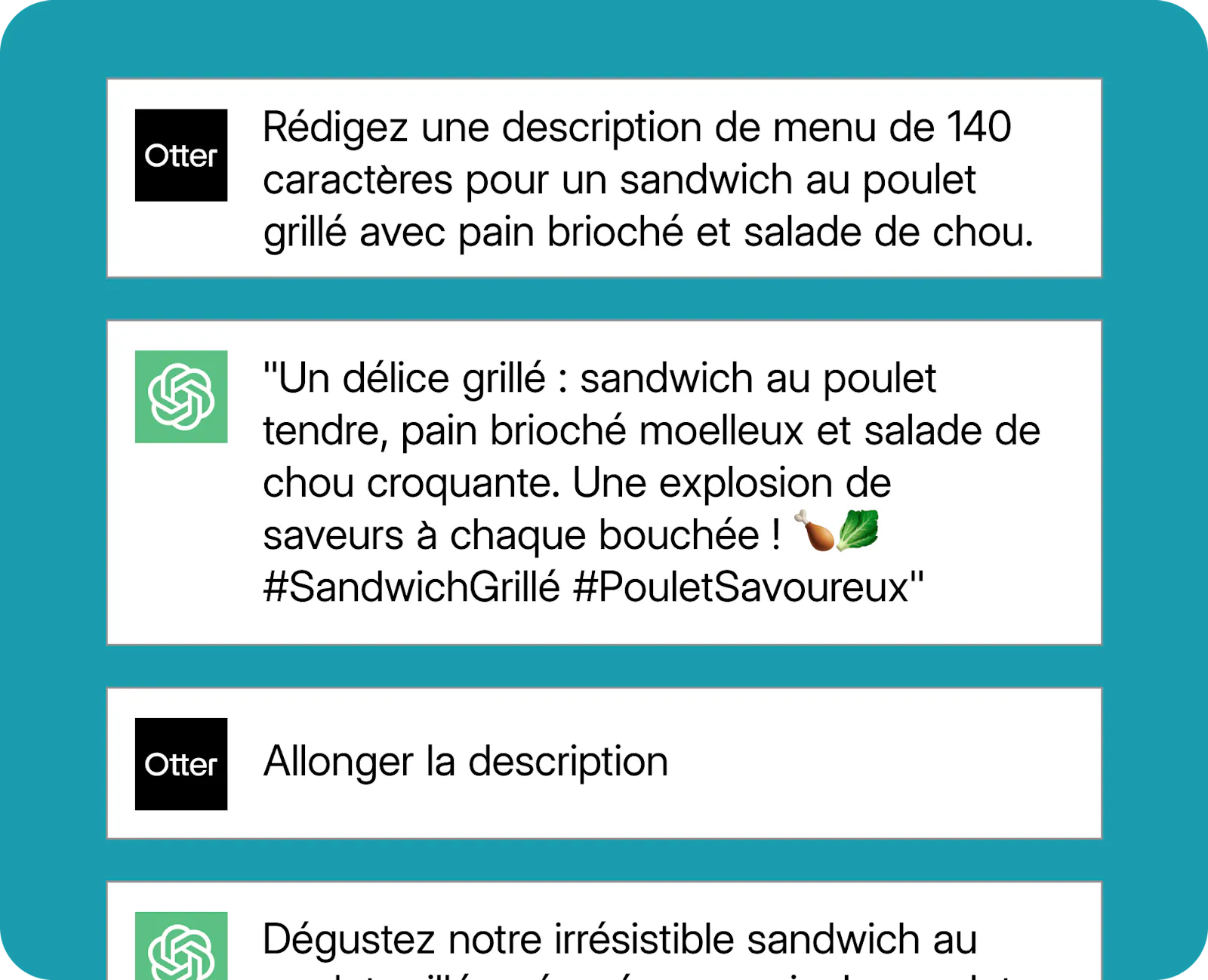 Avec sa capacité à générer du contenu créatif et engageant, ChatGPT peut vous aider en matière de promotions, d'idées de menu, de publications sur les réseaux sociaux, de recrutement et bien plus encore.