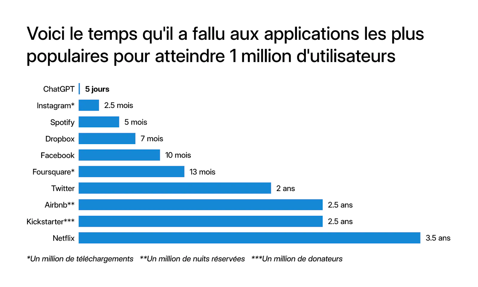 ChatGPT est un produit d'OpenAI, entité de recherche qui axe son travail sur le développement de technologies d'IA. Deux mois seulement après son lancement fin 2022, il atteignait déjà 100 millions d'utilisateurs actifs mensuels, ce qui en fait l'application grand public à la croissance la plus rapide de l'histoire.