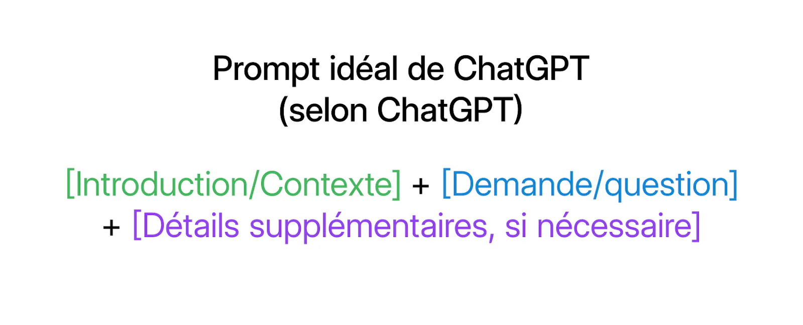 Bien qu'il n'y ait pas de formule spécifique pour définir le prompt ChatGPT parfait, vous pouvez suivre une trame générale pour augmenter la probabilité d'obtenir des réponses pertinentes. Les concepteurs de ChatGPT recommandent ce qui suit :
