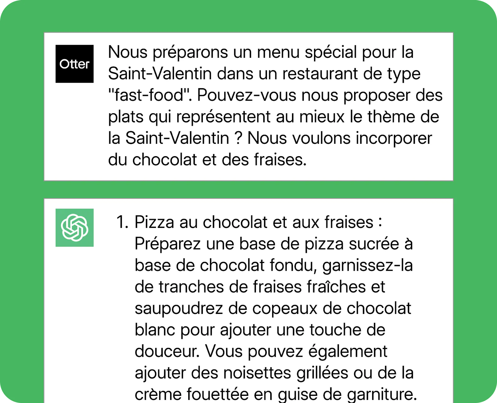 Utilisez la créativité de ChatGPT dans votre restaurant pour proposer des idées de menus uniques, pour des événements spéciaux ou des promotions saisonnières, afin de créer une expérience culinaire enthousiasmante.