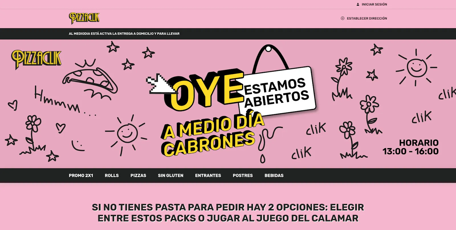 Basta echarle un vistazo a la presencia online de PizzaClik para entender que son diferentes. “Una startup nacida en Valencia hecha por gente rara”, como ellos mismos se definen en su perfil de LinkedIn. La página web de PizzaClik es rosa, llena de fotografías de producto divertidas y un diseño que no recuerda para nada a una página de pedidos tradicional. “Si no tienes pasta para pedir hay 2 opciones: elegir entre estos packs o jugar al juego del calamar”, reza la introducción de sus menús con nombres igual de ocurrentes como “alma de rata”, “alma roñosa” o “alma tacaña”.