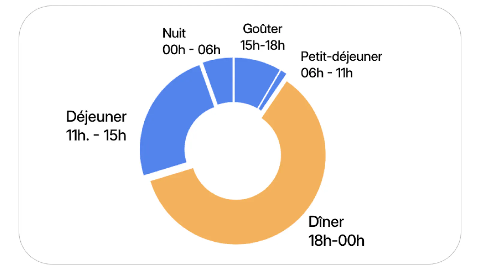 En été, le repas le plus populaire en livraison reste le dîner avec 57,3 % des commandes, suivi du déjeuner avec 26 %.