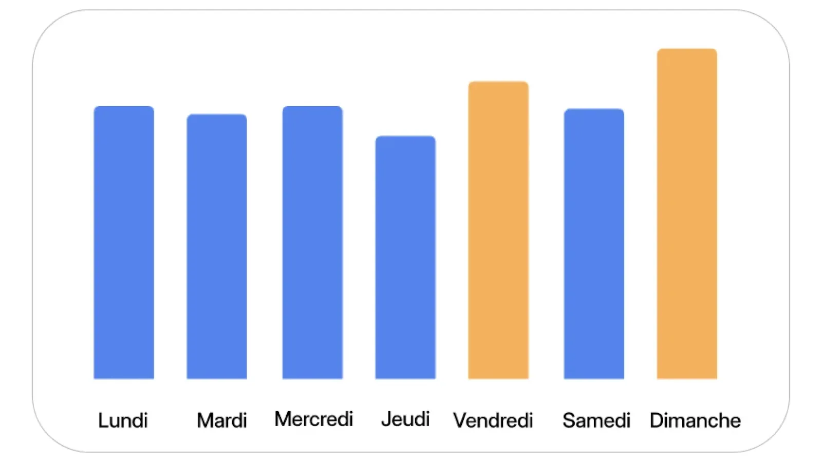 Nous avons constaté que le jeudi était le jour de livraison le plus chargé, avec 16,4 %du total des commandes dans une semaine. Il est suivi de près par le mercredi avec 15,3 %.