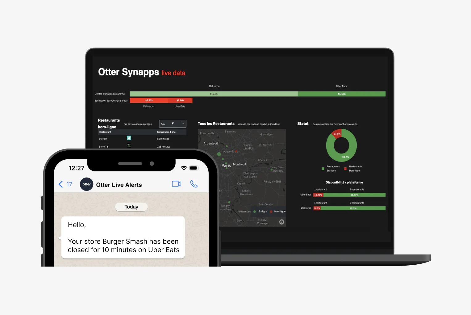 A maioria dos restaurantes descobre seu tempo de inatividade nas plataformas de entrega somente depois que ele acontece. Seja notificado instantaneamente sempre que uma de suas lojas ficar inoperante.
