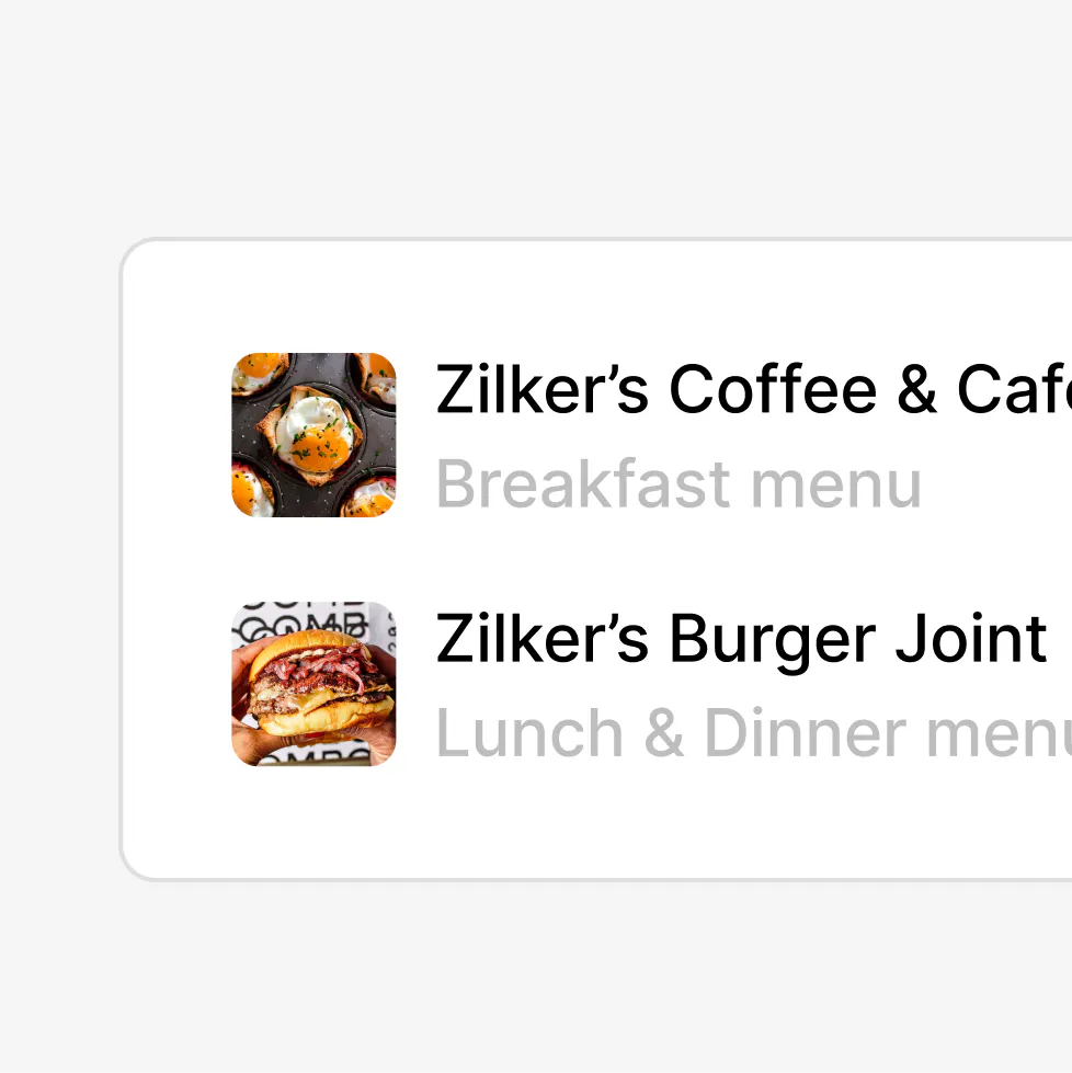 Separate menus by category, like breakfast, lunch, and dinner. Vary menus by location and keep changes in sync as things evolve.