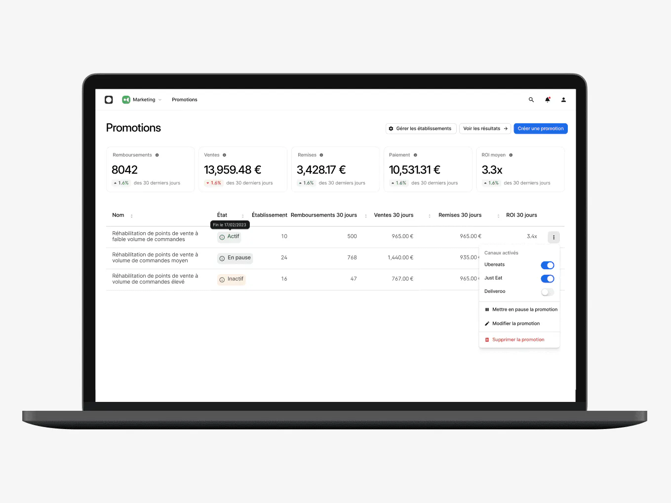 Promotions analyse les données de milliers de restaurants, la solution définit automatiquement vos promotions et optimise vos dépenses marketing pour vous offrir le meilleur retour sur investissement possible.
