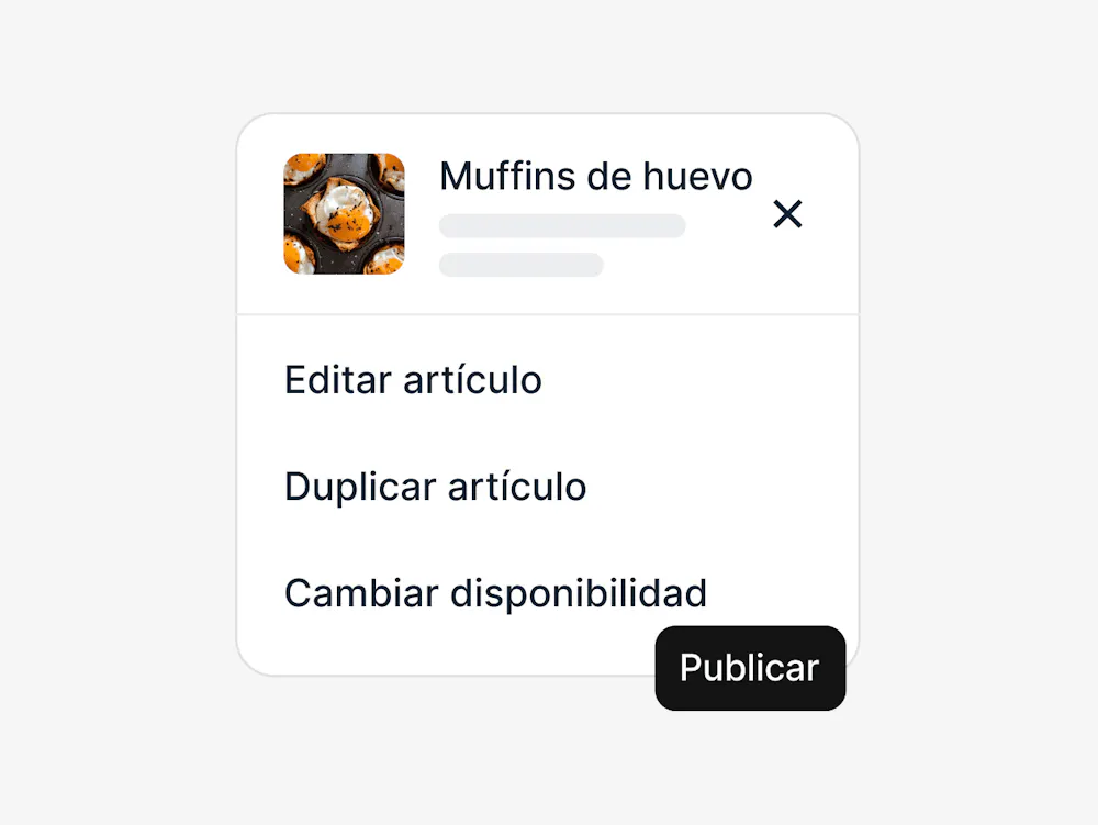 Toma el control total de tu menú en todos tus canales de venta. Añade, elimina, actualiza y marca temporalmente elementos como no disponibles en tiempo real.