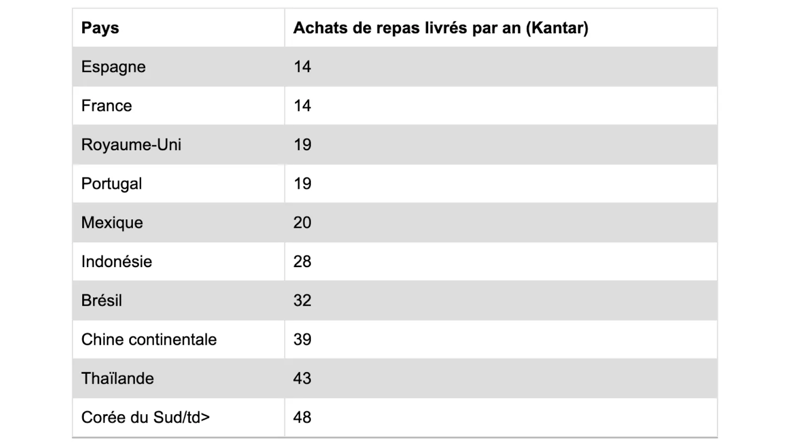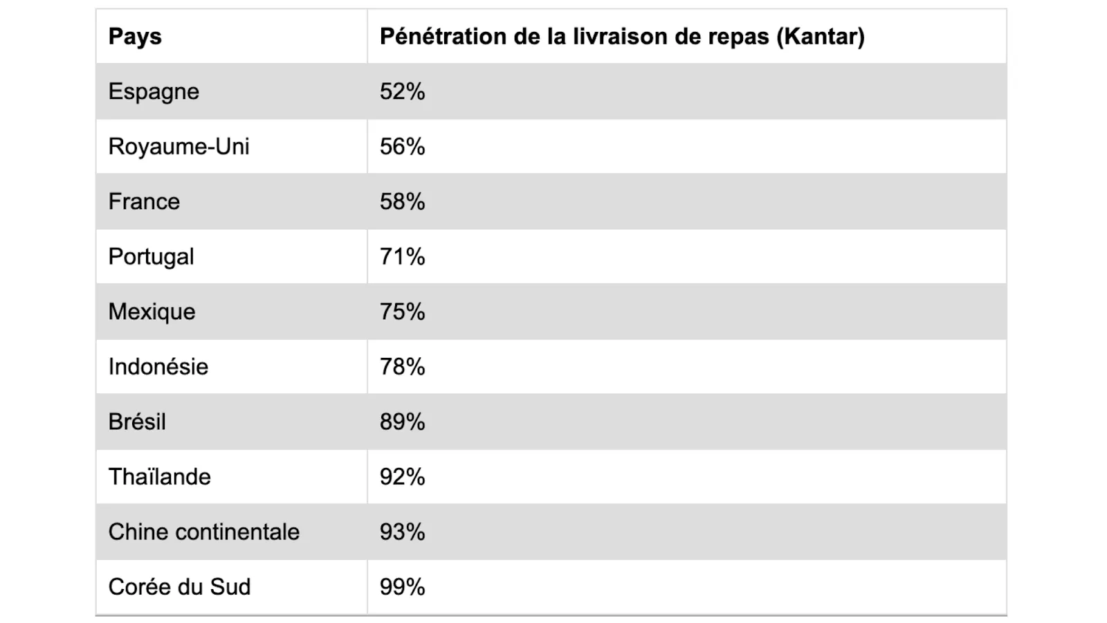 - Dans des pays comme le Portugal, l'Espagne, la Corée du Sud et la Thaïlande, plus de 60 % des personnes interrogées considèrent que la commodité est la principale raison pour laquelle elles commandent de la nourriture.
