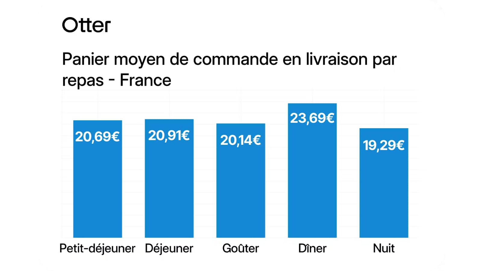 - Les Français dépensent en moyenne 22,33 € par commande de livraison de nourriture, mais ils sont prêts à dépenser un peu plus le week-end. Le panier moyen selon les repas présente, quant à lui, des écarts plus importants. Les Français dépensent plus d'argent et commandent plus pour le dîner que pour tout autre repas.