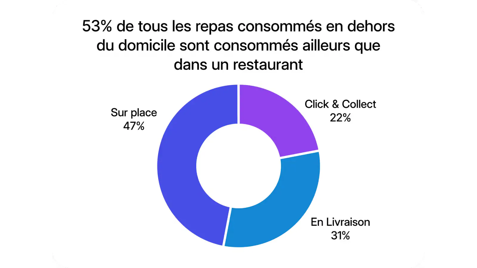 - En ce qui concerne les déjeuners et les dîners pris hors du domicile, 22 % des repas sont remis, 31 % sont livrés et 47 % sont pris dans des restaurants. Ainsi, 53 % des repas sont pris en dehors des restaurants (ce que Kantar appelle les « repas de restaurant à la maison »).