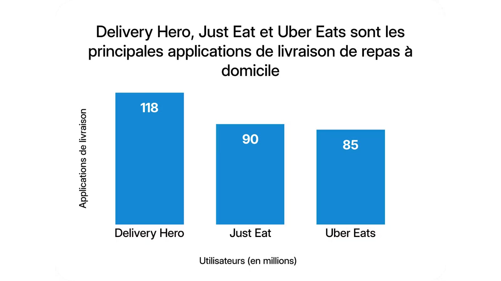 - Il est suivi par Just Eat (90 millions d'utilisateurs) et Uber Eats (85 millions d'utilisateurs).