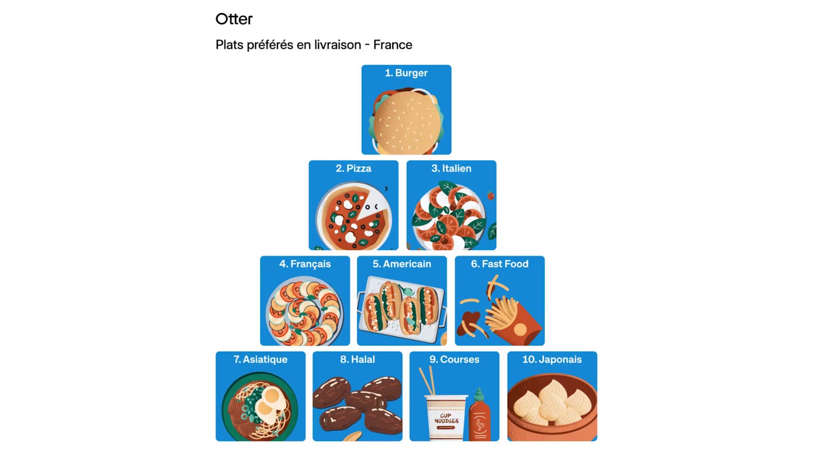 - Le plat préféré des Français est le burger! Du moins c'est leur plat préféré en livraison. Il est suivi par la pizza en deuxième place du classement et par la cuisine italienne en troisième. La cuisine française, quant à elle, occupe la quatrième place et avec l'essor de la livraison de courses à domicile ces dernières années, il n'est pas surprenant de trouver les courses dans le top 10.
