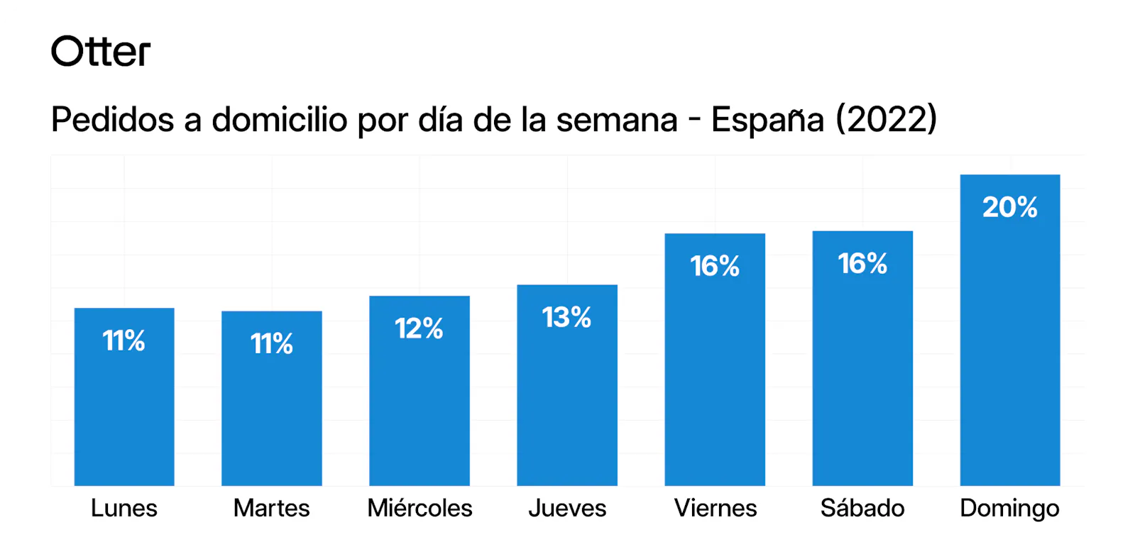El domingo es el día de mayor actividad para las entregas de comida a domicilio con 20% de todos los pedidos. Le siguen el sábado (16,3%) y el viernes (16,2%).