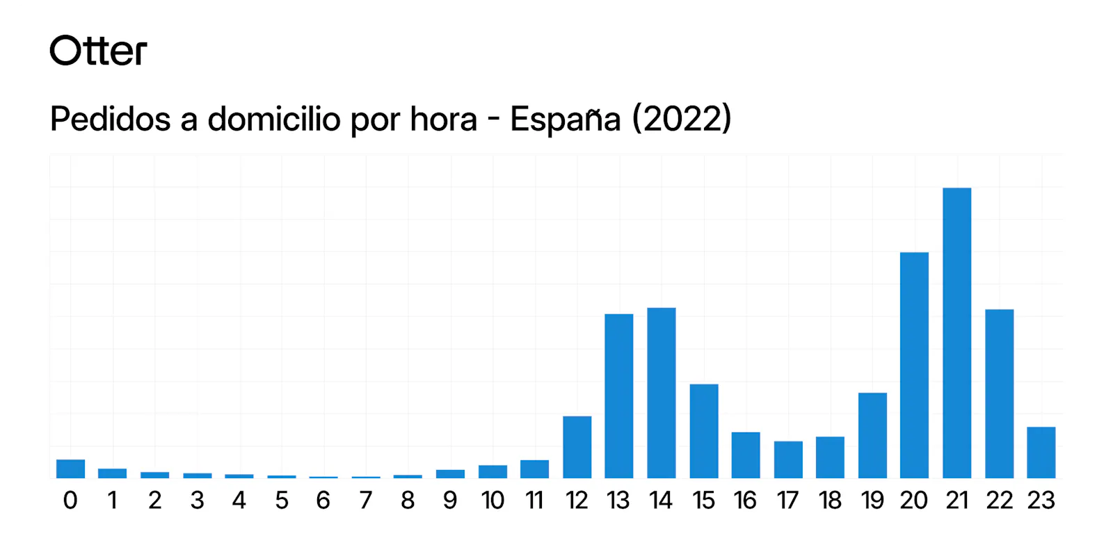 En cuanto a horas, la noche es la hora más popular para pedir comida a domicilio, siendo el horario de 21 a 22 horas el momento principal con diferencia.