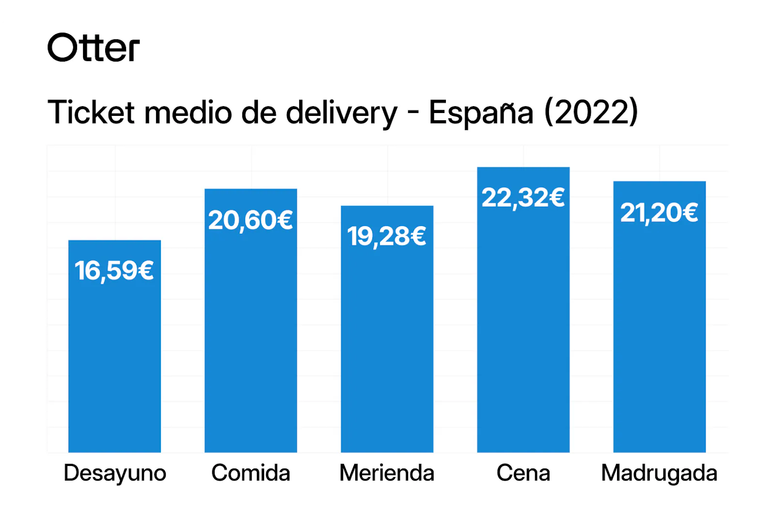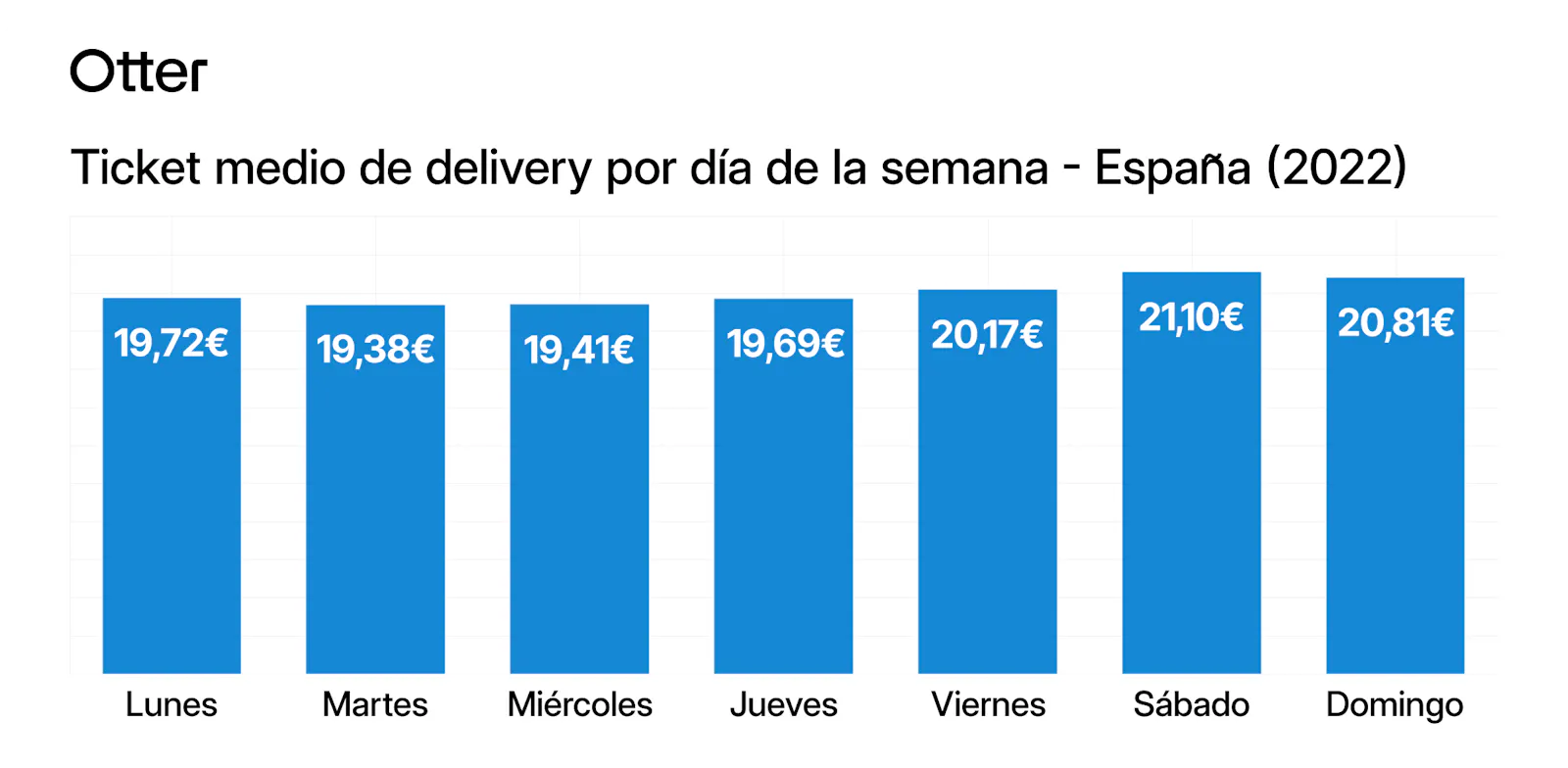 Los españoles gastan una media de 20,04€ por pedido, pero están dispuestos a gastar un poco más durante el fin de semana. El ticket medio crece los sábados en la noche: entre las 21 y las 22 horas, los españoles gastan 24,33€ de media por pedido.