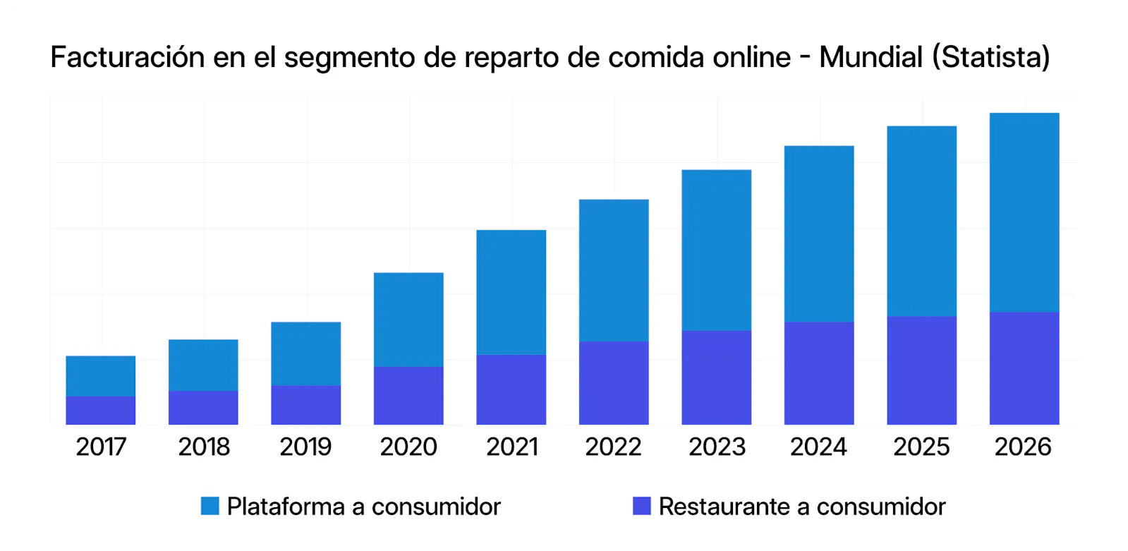 La entrega de comida a domicilio se ha convertido en un mercado global con un valor de más de 300.000 millones de dólares. El segmento más grande del mercado es la comida a domicilio que se entrega de la plataforma al consumidor (Platform-to-Customer). Un segmento monopolizado por apps como Uber Eats, Glovo y Just Eat en España.