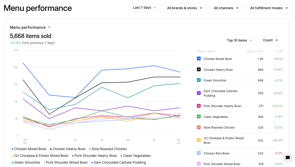 The Menu Performance tab gives you a thorough overview of your menus performance, customer-sourced item ratings, menu modifiers (like different sizes or add-ons), and popular item combinations. With the blocks in this tab, you can learn what your best-selling items are, whats driving the most profit, and whats helping you succeed!