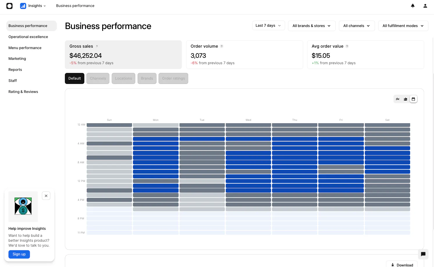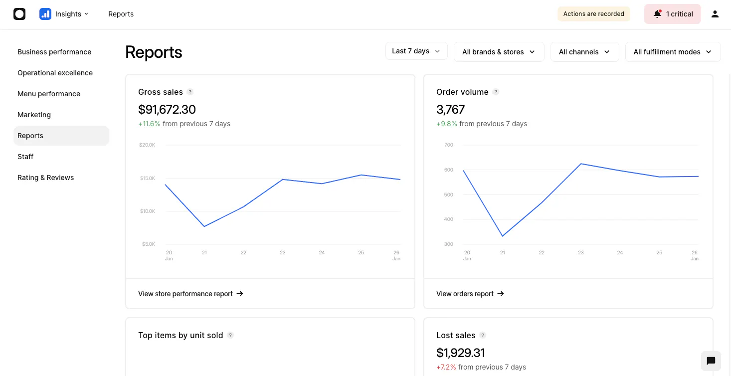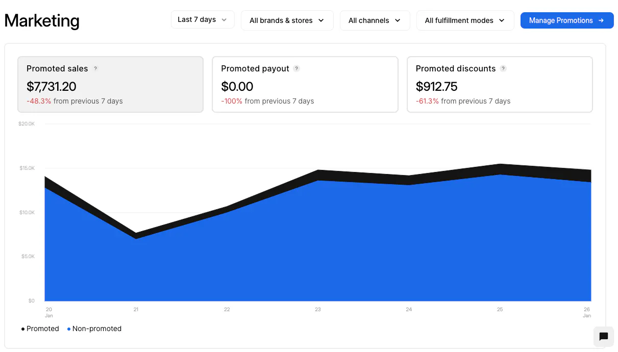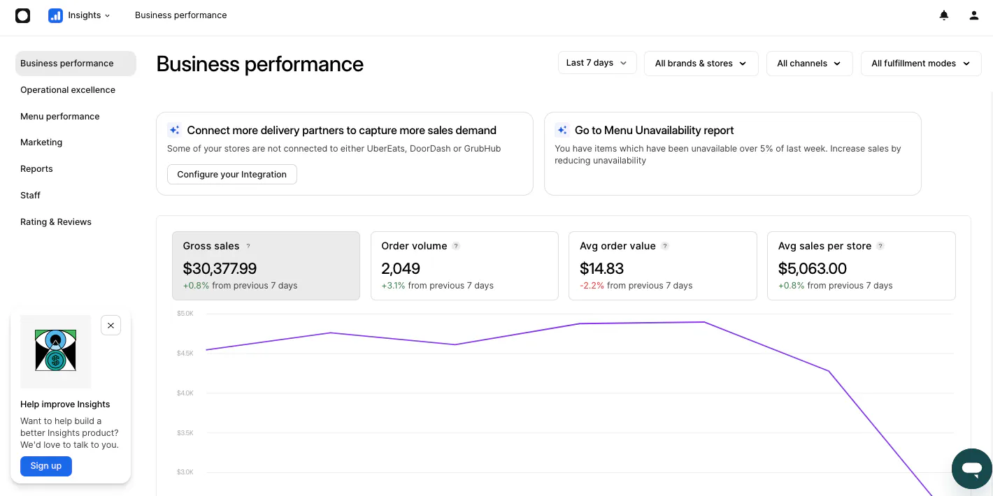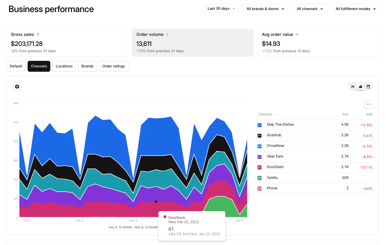 Use this tab to review sales and orders across all of your stores and channels. In this tab, you can see your complete Business Performance, Store Ranking, Channel Performance, and Fulfillment Performance. You can narrow down this information by location, timeframe, delivery app, and more by using the menus at the top of each block.