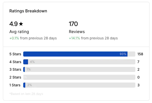 Advanced Analytics and Pro users have access to the Ratings & Reviews tab: a consolidated overview of customer feedback from across all of your delivery partners. Use the Ratings Breakdown, Average Weekly Ratings, and Store Ratings blocks to see what your customers think of your business.